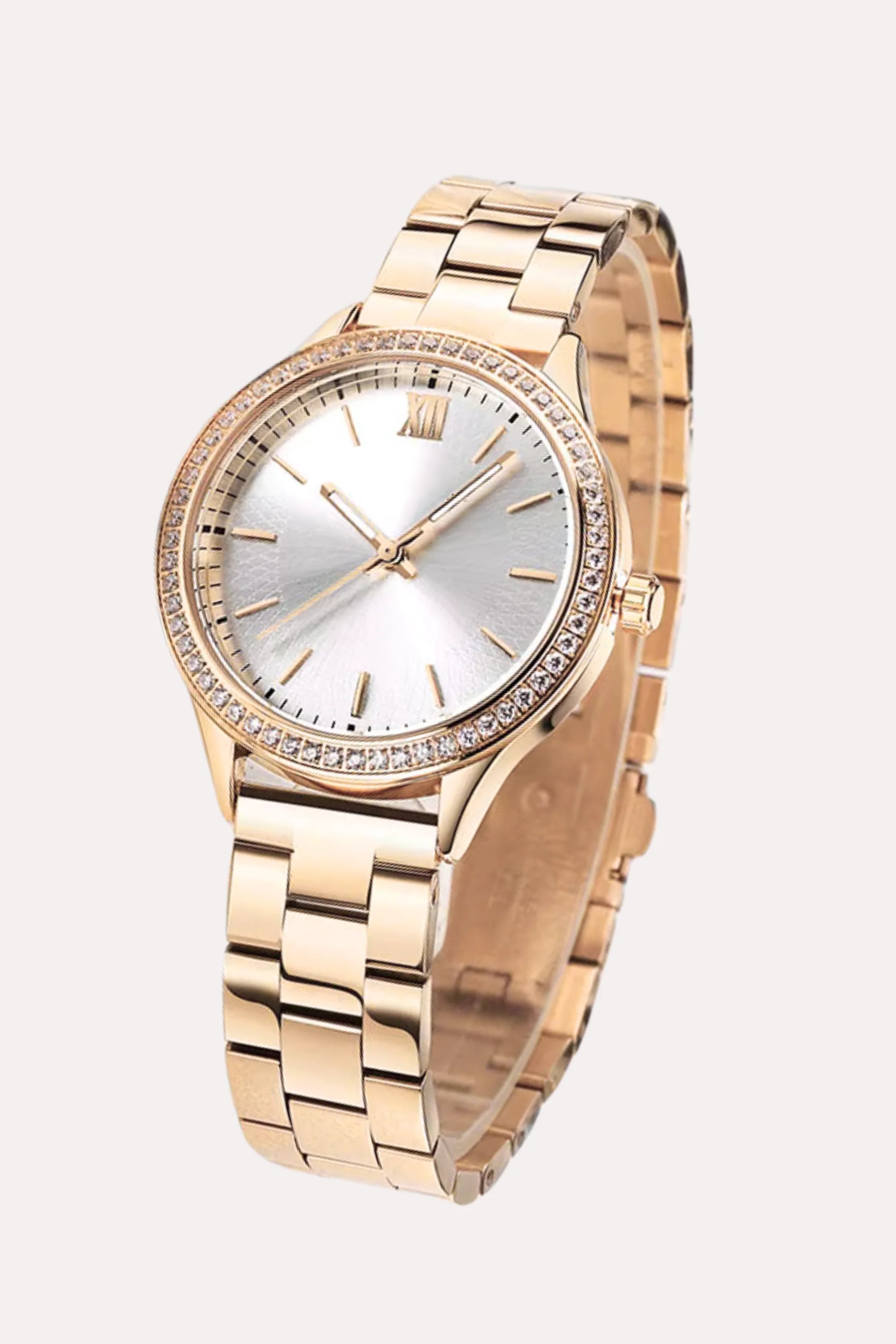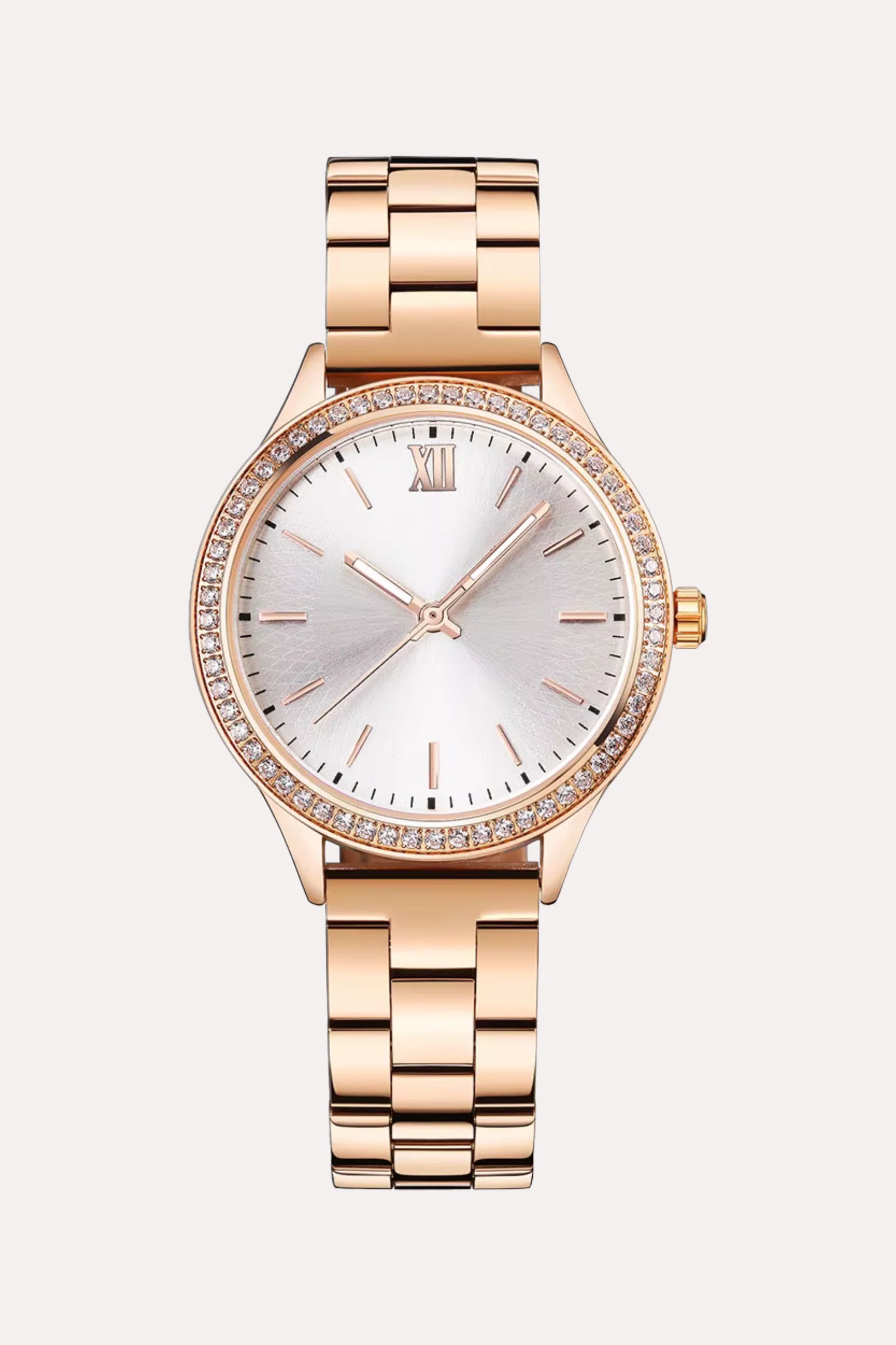 The Celestia Watch pairs timeless elegance with everyday functionality, creating a sophisticated statement on the wrist. Its radiant sunburst dial and crystal-studded bezel reflect a refined aesthetic, while its reliable quartz movement ensures precise timekeeping. Designed to complement both formal and casual looks, Celestia is where classic charm meets modern craftsmanship.